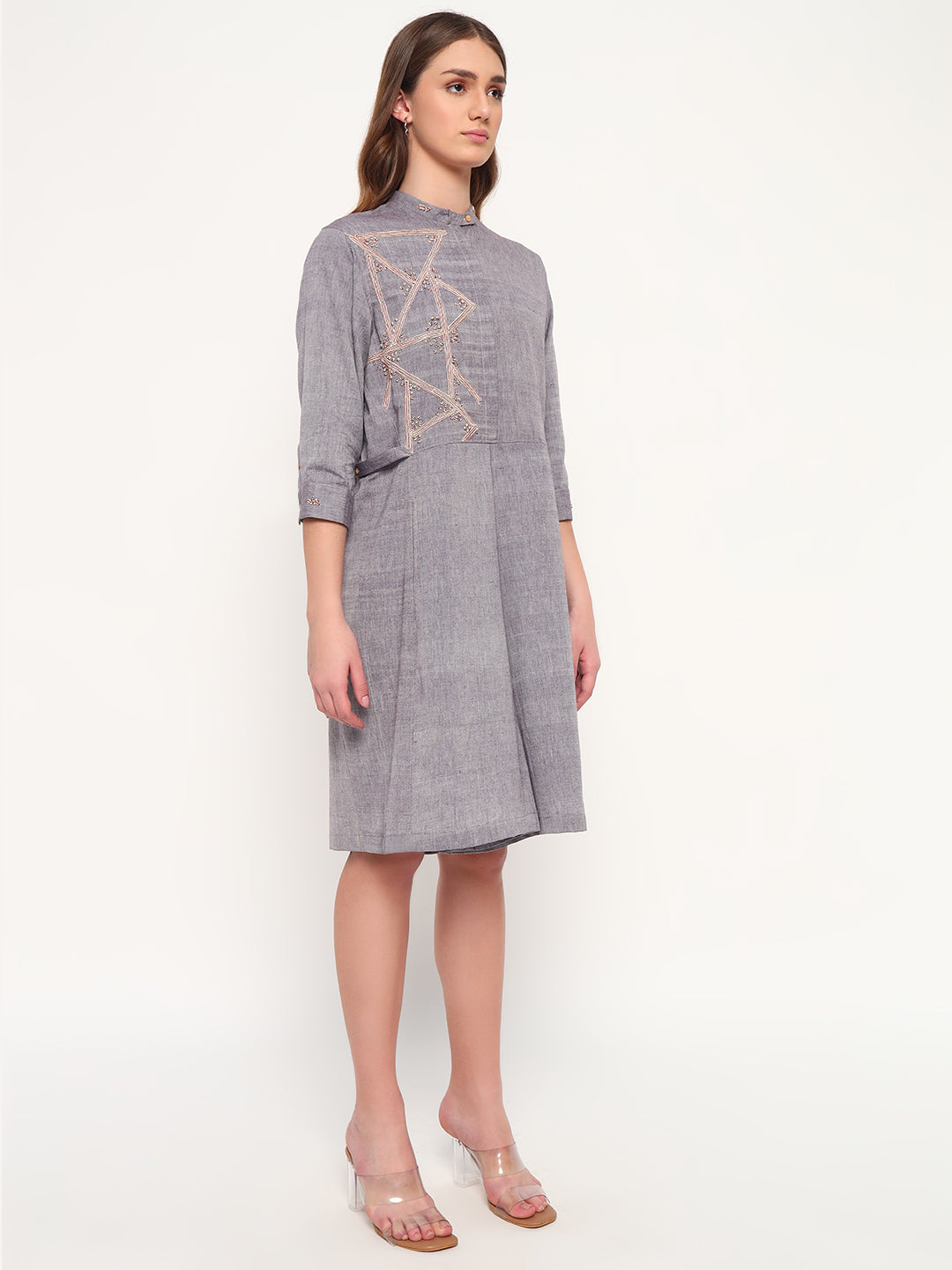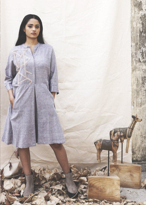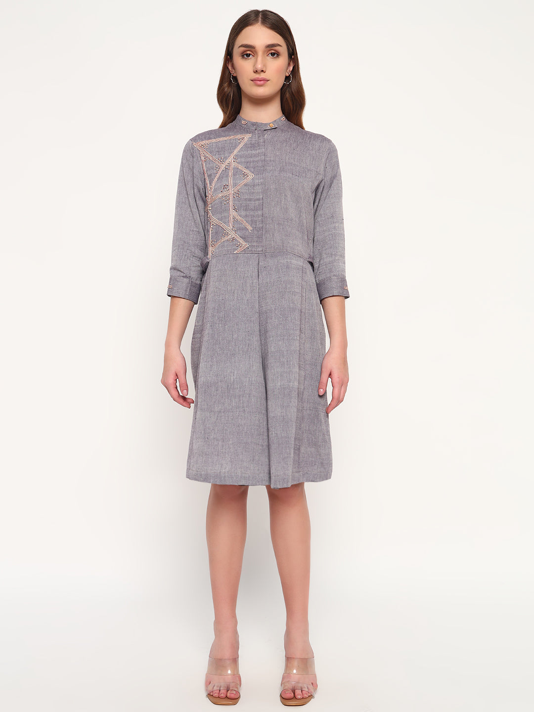 The blue-chambray hand-woven cotton fabric and the natural cord used for embroidery give this jumpsuit a sense of effortlessness and modernity that make a bridge between casual elegance and modern style. The easy fit, short legged Jumpsuit is designed to be easy to put on and get out of. The unique cut allows it to be unzipped from the back and be unbuttoned from the front, thus a allowing it to be slid down from the shoulders easily. A garment that adapts and adjusts to the rigours of a day outdoors or a weekend of travel.