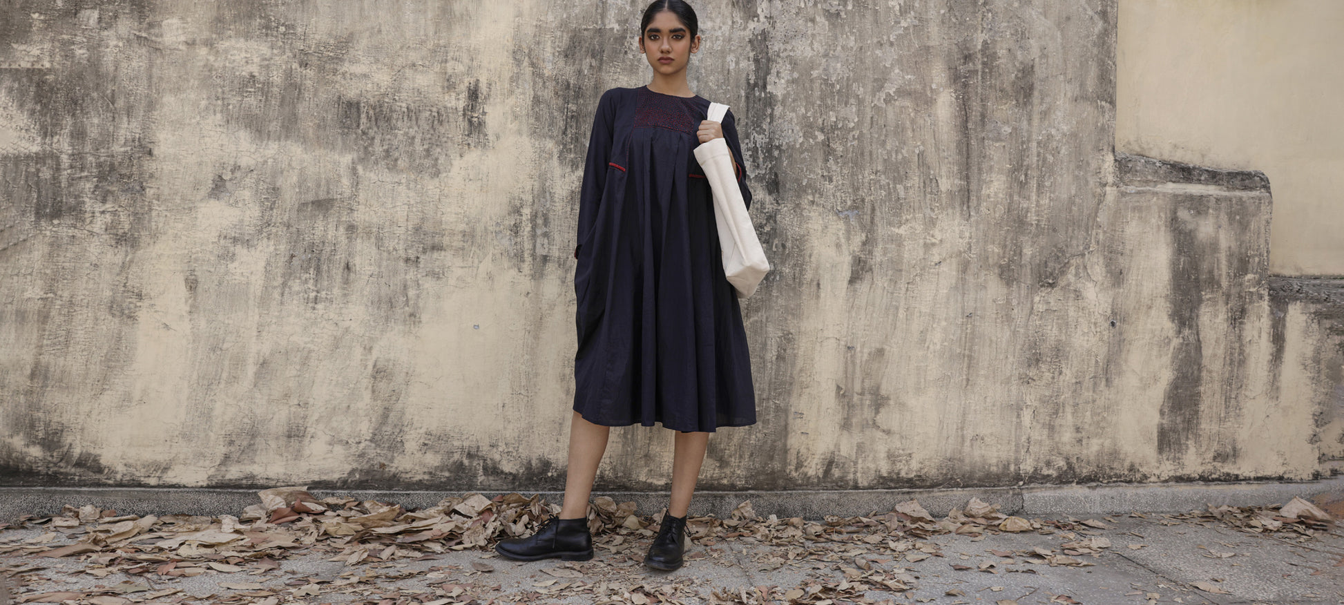 A dress in Navy silk-cotton hand-woven fabric that imbues sombre style with an element of playfulness. The knee-length flared dress is embroidered with quirky red-colour hand-embroidery stitches that give it an exquisite elegance with a touch of randomness. It's flared hem urge for an excited hop, a spontaneous twirl in the streets. The long flowing lines of this dress makes for a style statement that is elegantly casual and effortless.